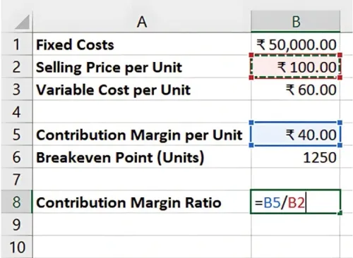 कंट्रीब्यूशन मार्जिन रेशियो (Contribution Margin Ratio) = 40 / 100 = 0.4