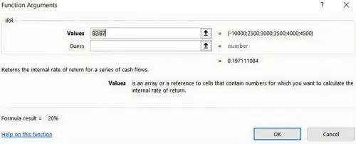 एक्सेल (Excel) वह आईआरआर (IRR) लौटाएगा जो नकद प्रवाह (cash flows) के एनपीवी (NPV) को शून्य के बराबर बनाता है। इस उदाहरण में, आईआरआर (IRR) लगभग 20% हो सकता है, जो सटीक नकद प्रवाह (cash flows) पर निर्भर करता है।