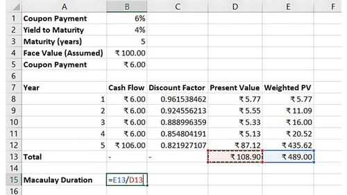 एक्सेल (Excel) में, मैकॉले ड्यूरेशन (Macaulay Duration) को प्रत्येक अवधि को उसके प्रेज़ेंट वैल्यू (present value) से वेटिंग (weighting) करके और इन वेटेड पीरियड्स (weighted periods) को जोड़कर कैलकुलेट (calculate) किया जा सकता है।