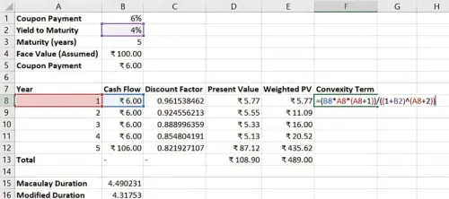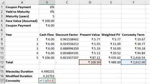 - वेटेड कैश फ्लो (weighted cash flows) को सम करते हुए एक्सेल (Excel) में कंवेक्सिटी फॉर्मुला (convexity formula) लागू करें।
