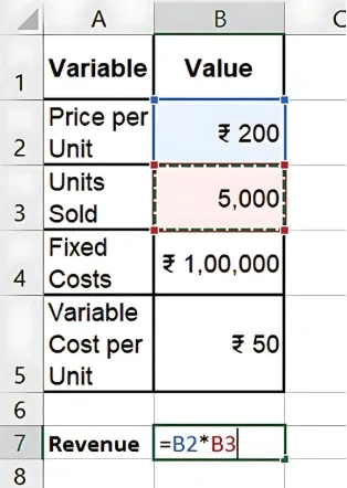रेवेन्यू (revenue) = प्रति यूनिट कीमत (Price per Unit) × बेचे गए यूनिट्स (Units Sold)