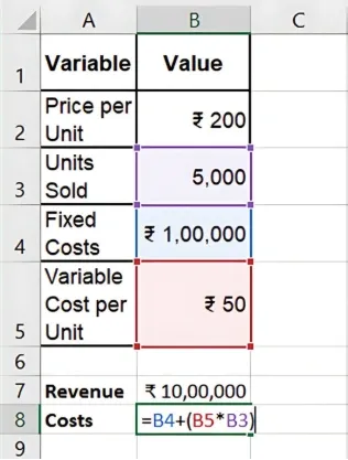 कॉस्ट्स (costs) = फिक्स्ड कॉस्ट्स (Fixed Costs) + (प्रति यूनिट वेरिएबल कॉस्ट्स (Variable Costs per Unit) × बेचे गए यूनिट्स (Units Sold))