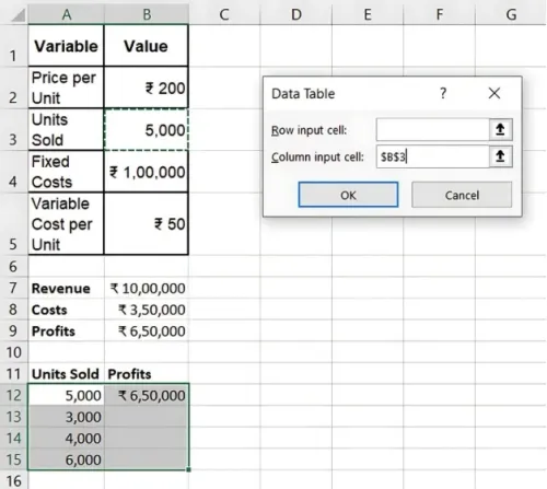 डेटा > वॉट-इफ एनालिसिस > डेटा टेबल (data table) का उपयोग करें और इनपुट के रूप में यूनिट्स सोल्ड (units sold) को निर्दिष्ट करें।