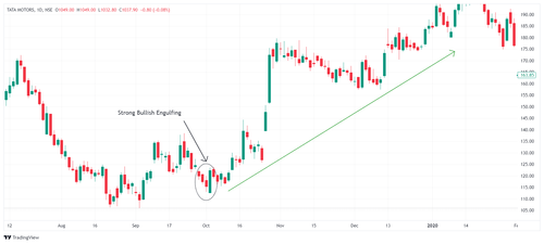 For Example, Tata Motors कुछ दिनों से डाउनट्रेंड में है, और ट्रेडर्स अनिश्चित हैं कि स्टॉक और गिरेगा या नहीं। फिर, एक दिन, एक छोटी लाल कैंडल बनती है, इसके बाद एक बड़ी हरी कैंडल आती है जो पूरी तरह से पिछली कैंडल को कवर कर लेती है। यह बुलिश एंगुल्फिंग पैटर्न (bullish engulfing pattern) संकेत देता है कि खरीदार वापस मार्केट में आ रहे हैं, और कीमत बढ़ने की संभावना है।