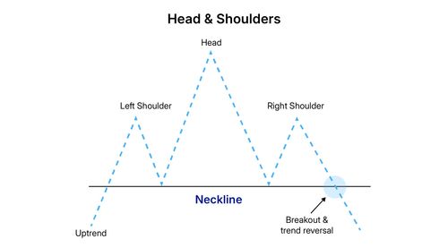 The हेड एंड शोल्डर्स (head and shoulders) पैटर्न एक पॉपुलर ट्रेंड रिवर्सल (trend reversal) पैटर्न है। इसमें तीन पीक शामिल होते हैं: लेफ्ट शोल्डर (left shoulder), हेड (head) (सबसे ऊंची पीक), और राइट शोल्डर (right shoulder)। यह पैटर्न संकेत देता है कि अपट्रेंड कमजोर हो रहा है, और एक बियरिश रिवर्सल (bearish reversal) संभव है।