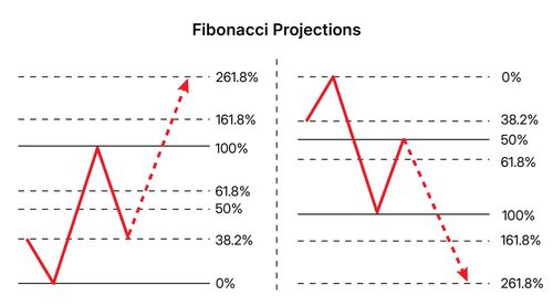 फिबोनाची प्रोजेक्शन्स (Fibonacci projections) का उपयोग यह निर्धारित करने के लिए किया जाता है कि रिट्रेसमेंट (retracement) के बाद एक प्राइस मूव (price move) कहाँ तक जा सकता है: