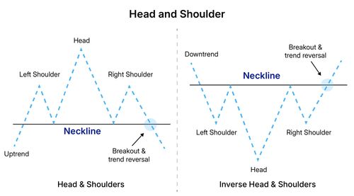 - हेड एंड शोल्डर्स: यह पैटर्न आमतौर पर एक अपट्रेंड के अंत में बनता है और बियरिश रिवर्सल का संकेत देता है।
