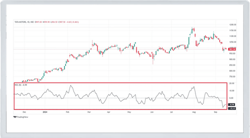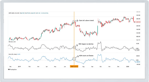 चलो HDFC बैंक को एक उदाहरण के रूप में लेते हैं। मान लो स्टॉक कई हफ्तों से अपट्रेंड में है। मोमेंटम इंडिकेटर (momentum indicator) एक पॉजिटिव रीडिंग दिखाता है, लेकिन यह फ्लैटन होना शुरू हो जाता है जबकि स्टॉक की कीमत बढ़ती रहती है। उसी समय, ROC गिरने लगता है, जो दर्शाता है कि कीमत बढ़ने की दर धीमी हो रही है। यह कीमत, मोमेंटम, और ROC के बीच की बियरिश डाइवर्जेंस (bearish divergence) संकेत देती है कि अपट्रेंड कमजोर हो सकता है, और एक रिवर्सल पास हो सकता है।
