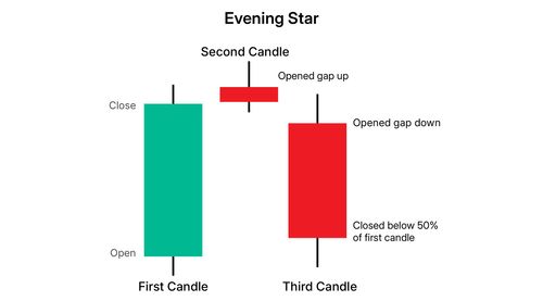 इवनिंग स्टार मॉर्निंग स्टार का बियरिश काउंटरपार्ट है, जो संकेत देता है कि एक अपट्रेंड समाप्त हो गया है। इवनिंग स्टार एक अपट्रेंड के शीर्ष पर होती है और इसमें तीन कैंडलस्टिक्स शामिल होते हैं: