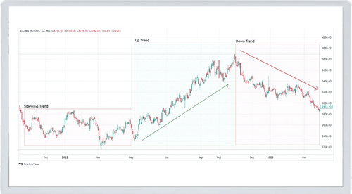 एक ट्रेंड वो सामान्य दिशा होती है जिसमें एक स्टॉक (stock) की कीमत मूव कर रही होती है। स्टॉक्स (stocks) या तो ऊपर की ओर (bullish), नीचे की ओर (bearish) या साइडवेज़ (sideways) मूव कर सकते हैं। ट्रेंड्स (trends) की पहचान करने से ट्रेडर्स (traders) को यह निर्णय लेने में मदद मिलती है कि कब किसी पोजीशन (position) में एंटर (enter) या एग्जिट (exit) करना है।