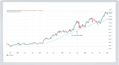 एक मूविंग एवरेज (moving average) एक विशेष अवधि, जैसे 50 दिनों में, प्राइस डेटा को स्मूद करता है और ट्रेडर्स को ओवरऑल ट्रेंड पहचानने में मदद करता है। अगर किसी स्टॉक की कीमत उसके मूविंग एवरेज (moving average) से ऊपर है, तो यह एक अपट्रेंड का संकेत देता है।