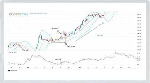 चलो इन्फोसिस (Infosys) को एक उदाहरण के तौर पर लेते हैं। मान लीजिए कि प्राइस एक टाइट रेंज में मूव कर रही है, और बोलिंजर बैंड्स (Bollinger Bands) ने सिकुड़ना शुरू कर दिया है, जो एक स्क्वीज़ (squeeze) का संकेत दे रहे हैं। उसी समय, एटीआर (ATR) कम है, जो कन्फर्म करता है कि वोलेटिलिटी (volatility) न्यूनतम है। एक ट्रेडर को ब्रेकआउट (breakout) की उम्मीद हो सकती है, इसलिए वे प्राइस को ध्यान से मॉनिटर करते हैं। एक बार जब प्राइस अपर बोलिंजर बैंड (upper Bollinger Band) के ऊपर ब्रेक करती है और एटीआर (ATR) बढ़ने लगता है, तो यह कन्फर्म करता है कि ब्रेकआउट (breakout) बढ़ी हुई वोलेटिलिटी (increased volatility) द्वारा समर्थित है, जो एक संभावित खरीदारी के अवसर का संकेत है।