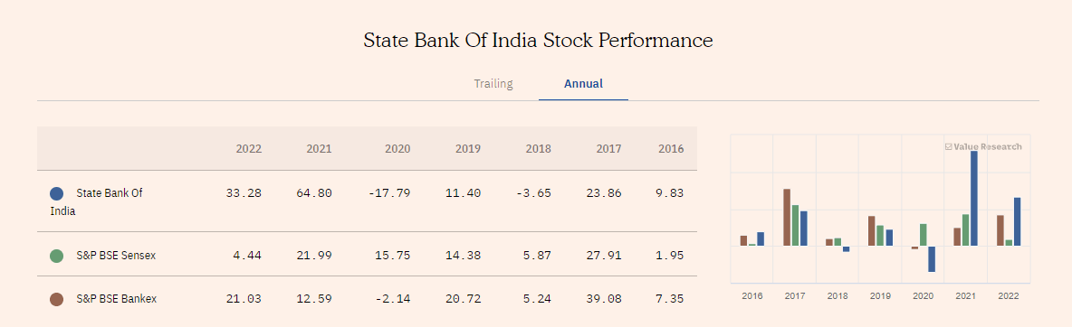 - In 2022, annual returns from SBI's stocks stood at 33.28%.