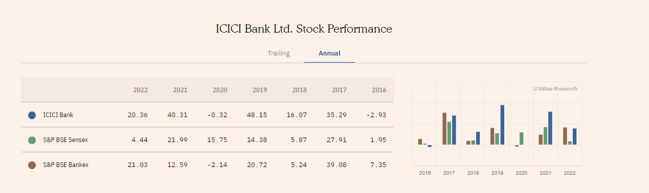 In 2022, returns from ICICI Bank's stocks stood at 20.36%.