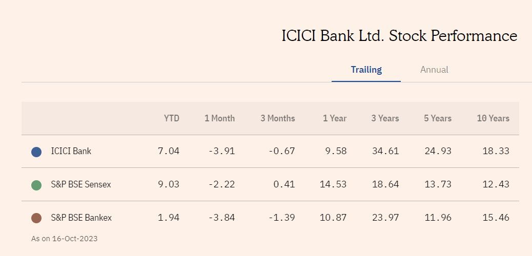 - As of 16th October 2023, the 3-year trailing returns of ICICI Bank’s stock stood at 33.61%.