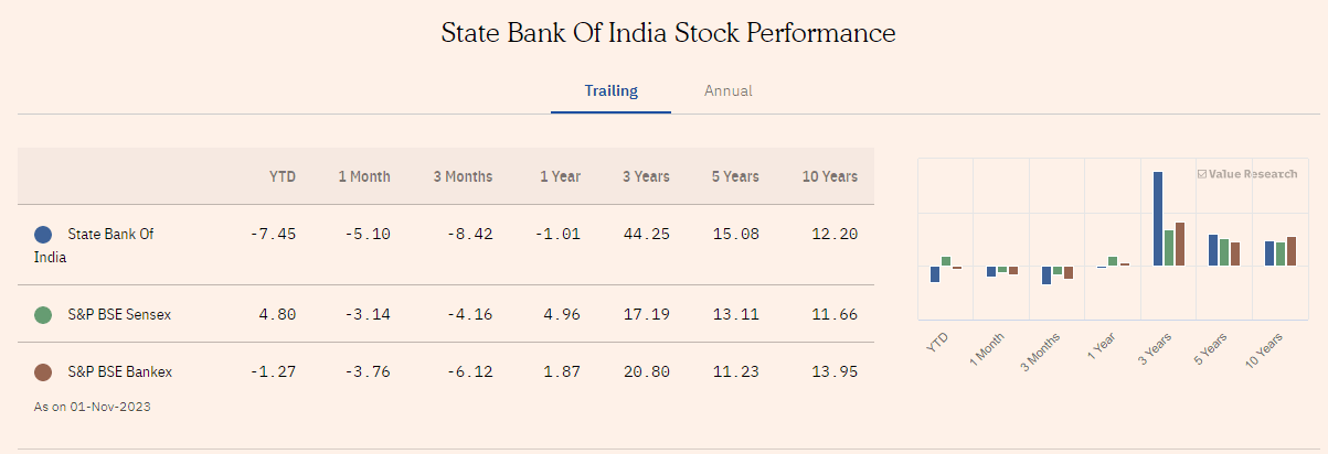 - As of 1st November 2023, the 3-year trailing return of SBI stocks stood at 44.25%