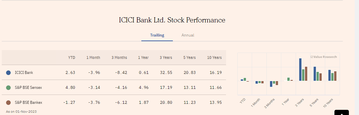 - As of 1st November 2023, the 3-year trailing returns from ICICI Bank's stock stood at 33.14%.