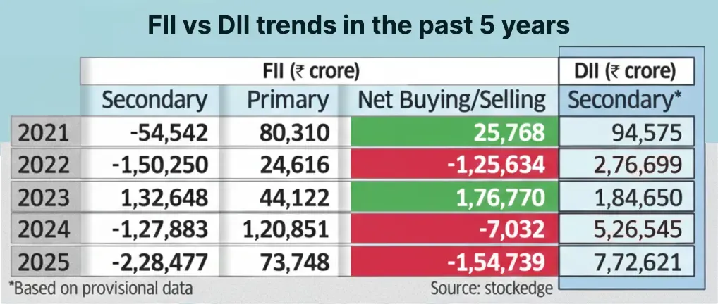 DIIs poured in ₹7.7 lakh crore through mutual funds and pension flows, absorbing selling pressure with admirable consistency.
