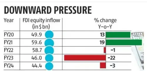 FDI equity inflows fell to $44.42 billion in FY24, a five-year low.
