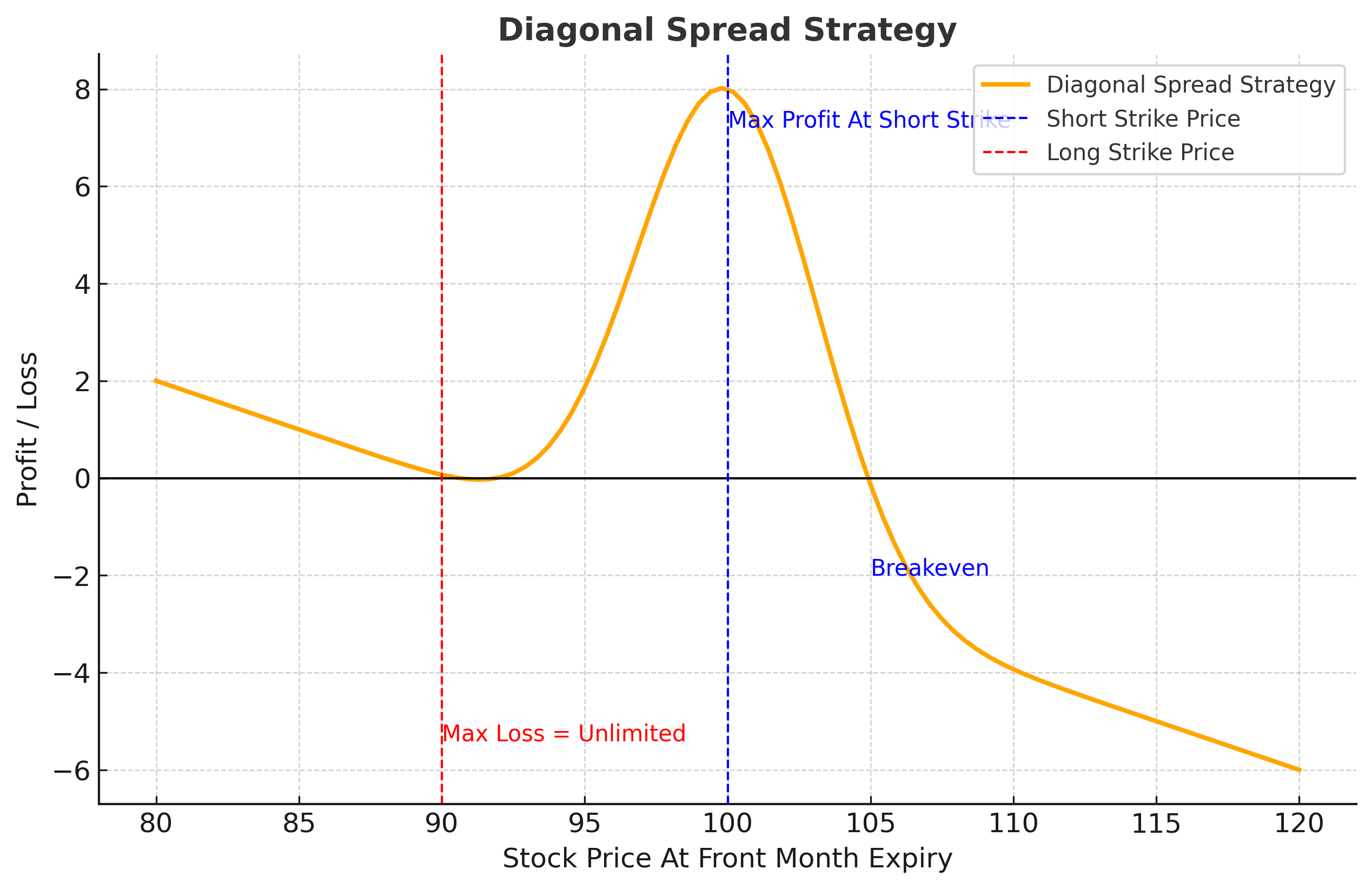 This strategy creates a diagonal relationship between strike prices and expiration dates, hence the name. It allows traders to take a directional view on the market while taking advantage of time decay and volatility changes.