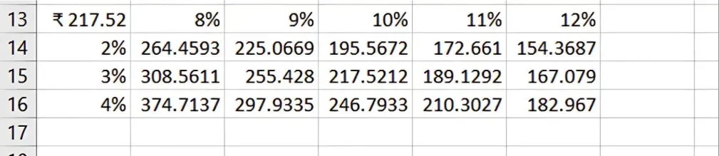 Excel will automatically calculate the NPV for each combination of discount rates and growth rates, filling out the sensitivity table.