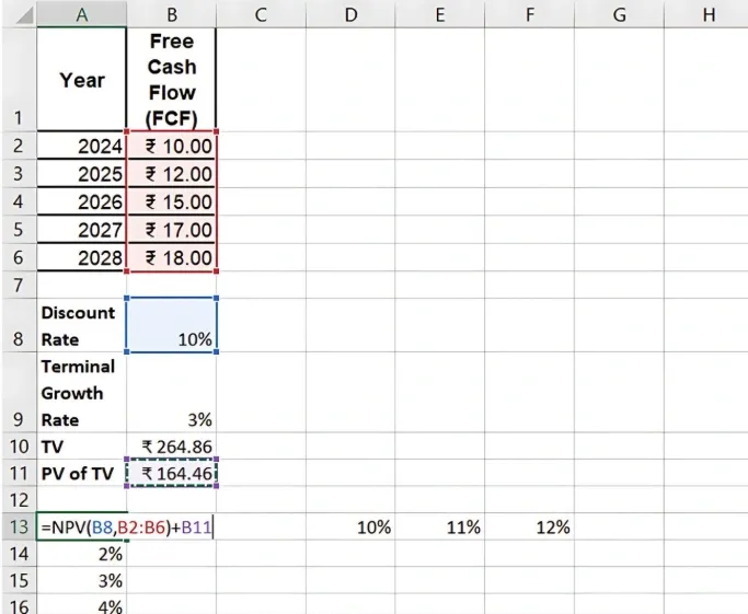 Terminal Growth Rate (g): Test different growth rates (e.g., 2%, 3%, 4%).