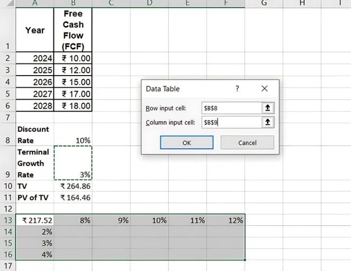 - For the Column Input Cell, select the cell where the terminal growth rate is entered.