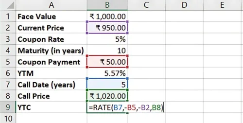 Result: The YTC is approximately 3.68%, reflecting the bond’s yield if called in 5 years.