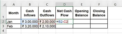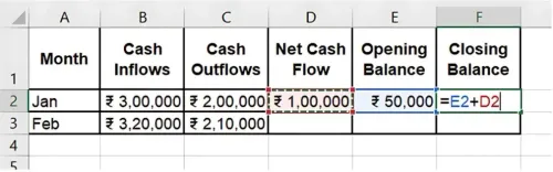 Closing Balance: Add the Opening Balance to the Net Cash Flow. =Opening Balance + Net Cash Flow