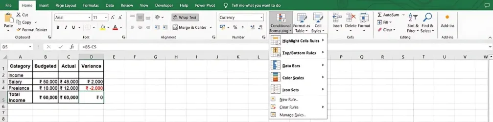 - Conditional Formatting: Highlight variances to easily spot overspending or underspending.