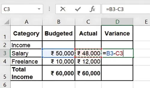- For Variance: Calculate the difference between Budgeted and Actual with =Budgeted - Actual.