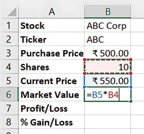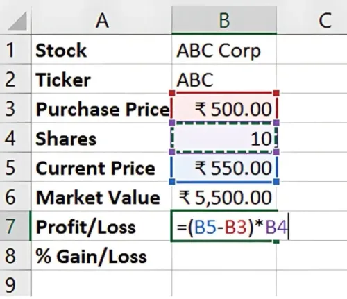 Calculate the difference between Market Value and Purchase Price to find Profit/Loss.
