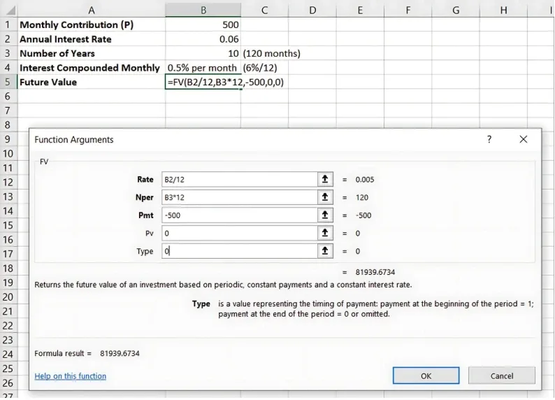 For example, if you deposit ₹500 per month in a savings plan with a 6% annual interest rate (compounded monthly) for 10 years, you would calculate the future value using this formula or Excel's built-in functions.
