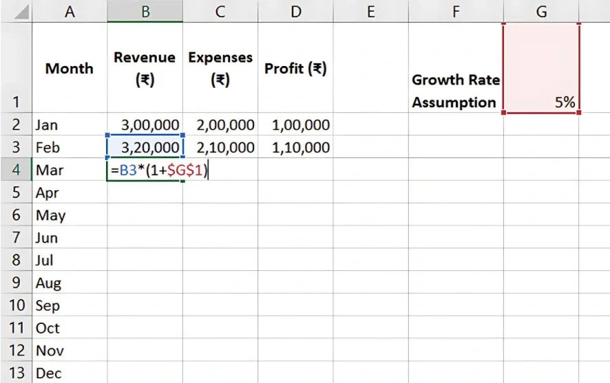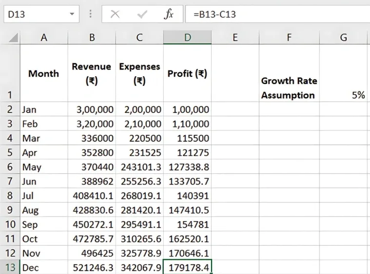 For a 12-month rolling forecast, create columns for future months based on baseline assumptions, like a 5% revenue growth.