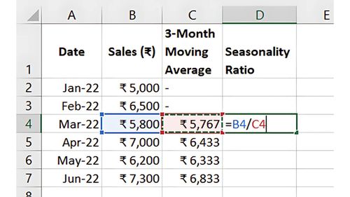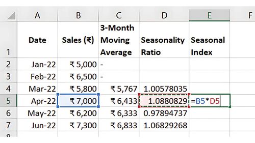 - Divide actual sales by the moving average or trend line value to find a seasonality ratio.