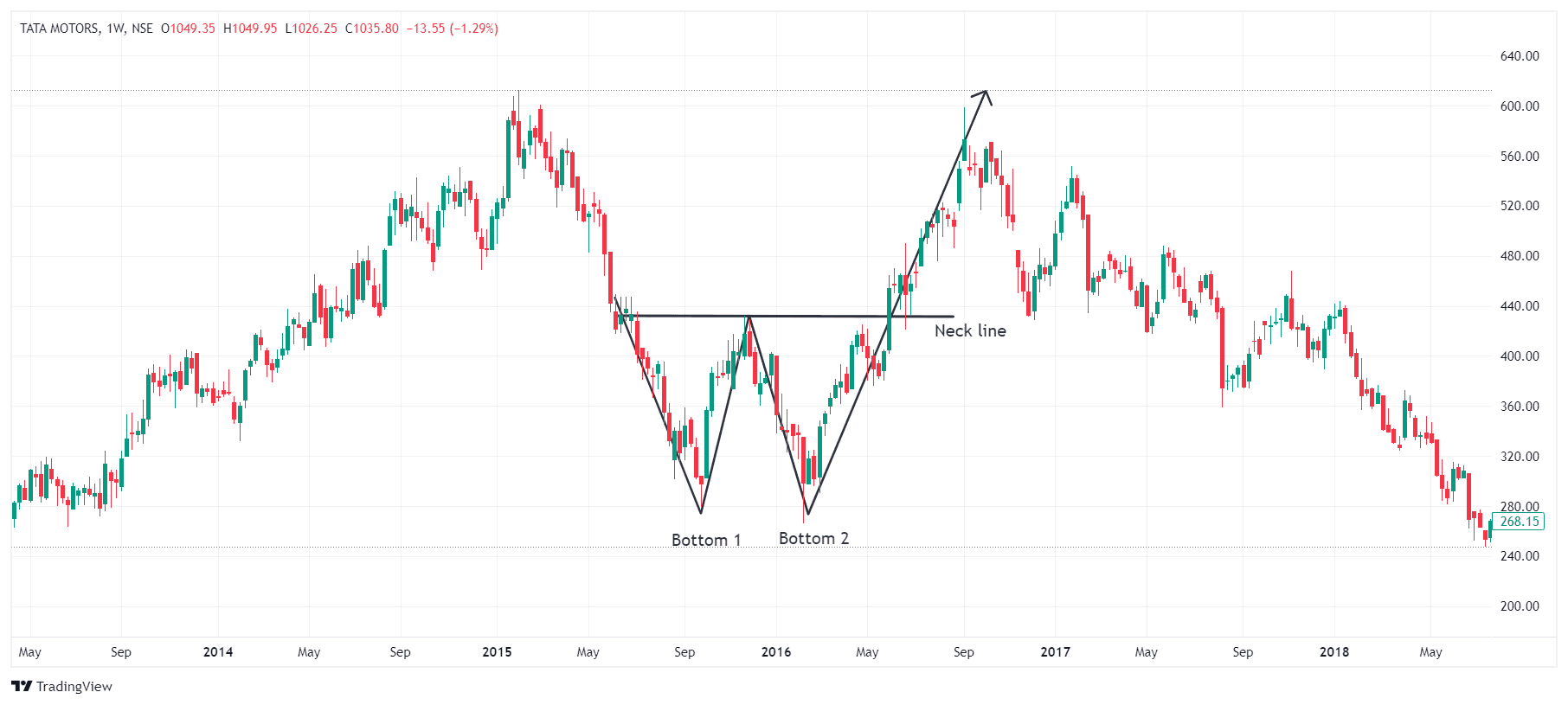 Let’s say Tata Motors is in a downtrend and falls to ₹275, rebounds to ₹430, and then drops again to ₹275. When the stock breaks above ₹430, the Double Bottom pattern is confirmed, signalling a bullish reversal. Traders may consider buying at this point, expecting further gains as the stock reverses its downward trend.
