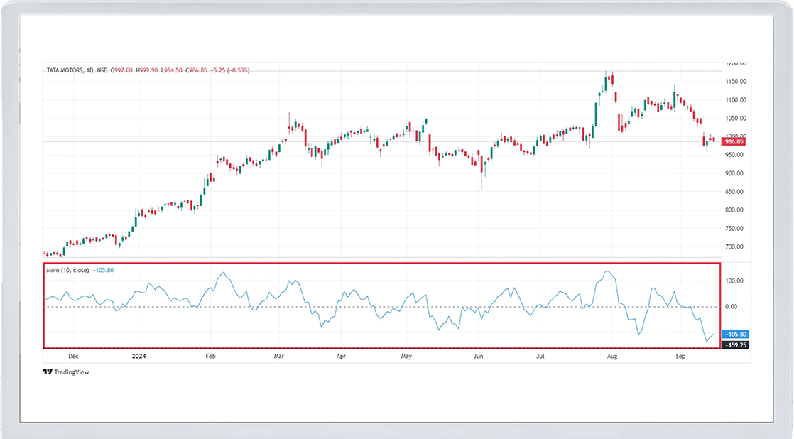 For example, if you’re calculating a 10-period Momentum Indicator and the current price of a stock is ₹100 while the price ten days ago was ₹90, the momentum would be +10, indicating upward momentum.