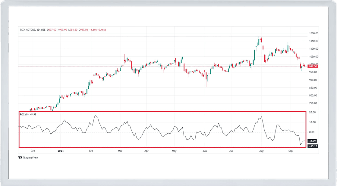 Negative ROC: When the ROC is negative, it indicates that the price is lower than it was n periods ago, signalling downward momentum. The more negative the ROC, the stronger the bearish move.