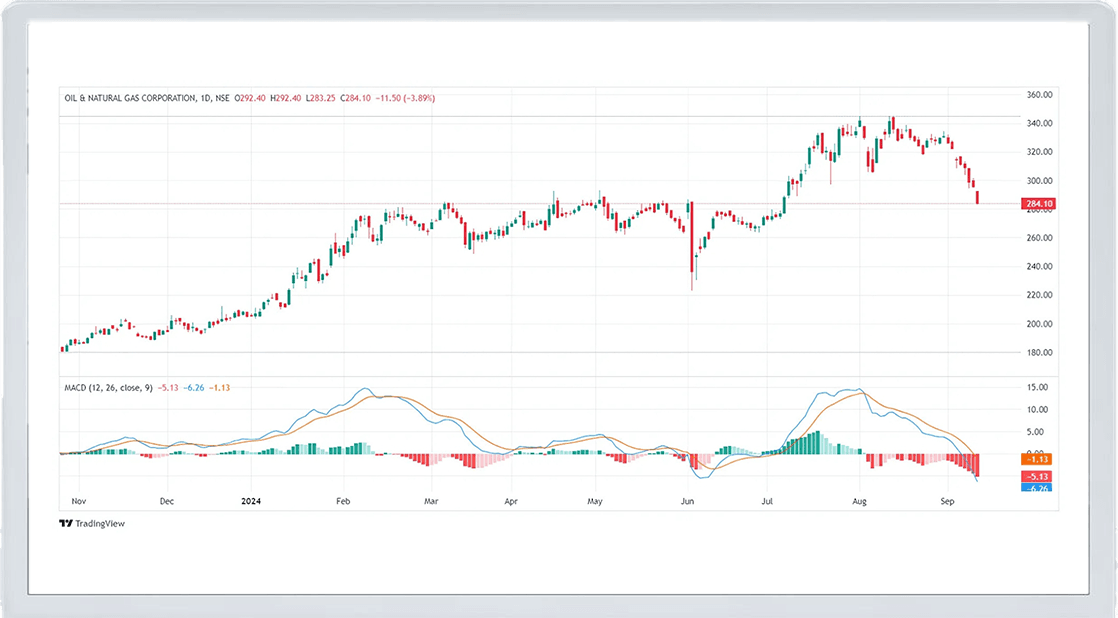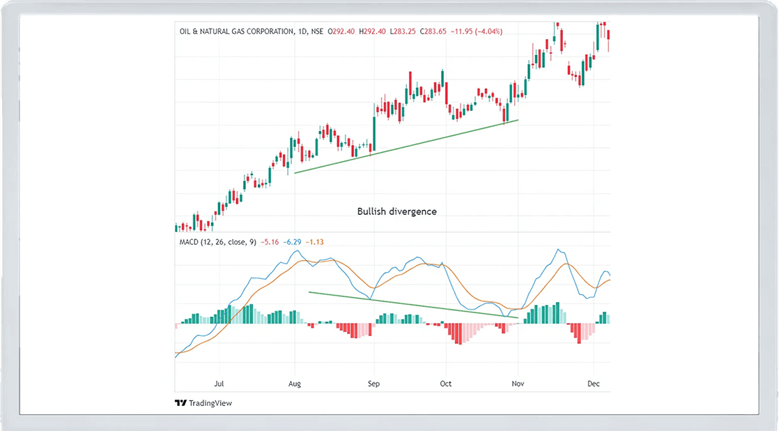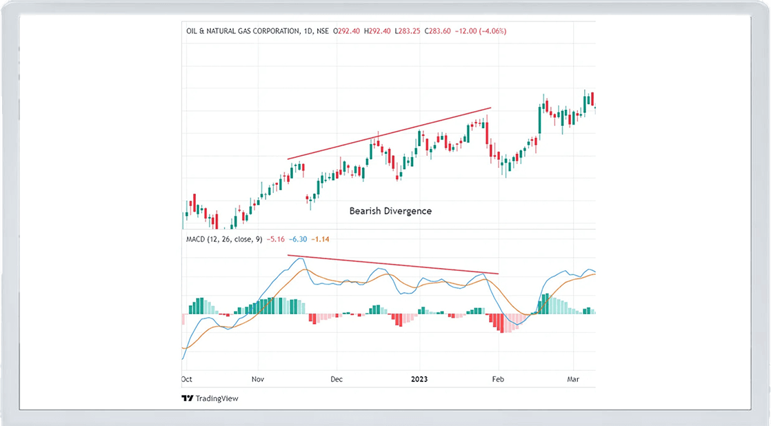 Imagine HDFC Bank has been in an uptrend, with the price rising steadily. However, traders notice a bearish divergence: while the stock is making new highs, the MACD line is making lower highs. This suggests that the upward momentum is weakening, and the price may soon reverse. Traders might choose to exit their long positions or even enter short positions in anticipation of a downturn.