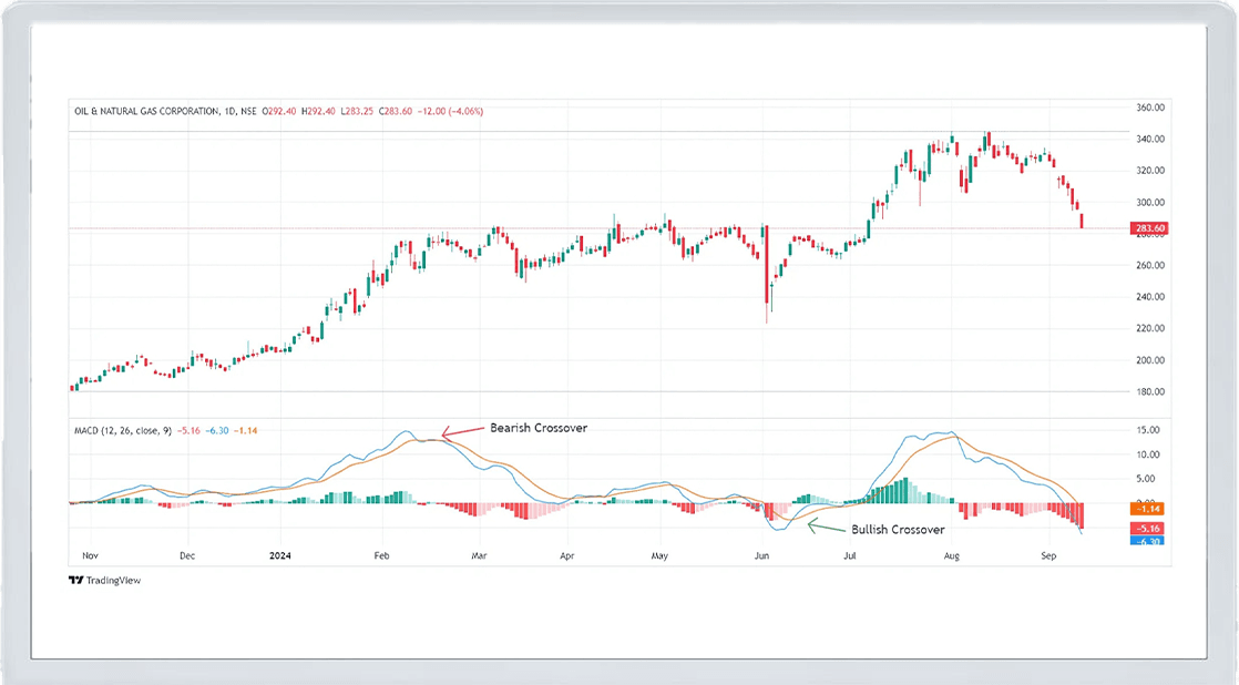 Bearish Crossover: When the MACD line crosses below the signal line, it indicates a potential sell signal. This suggests that downward momentum is increasing, and the stock may continue to fall.
