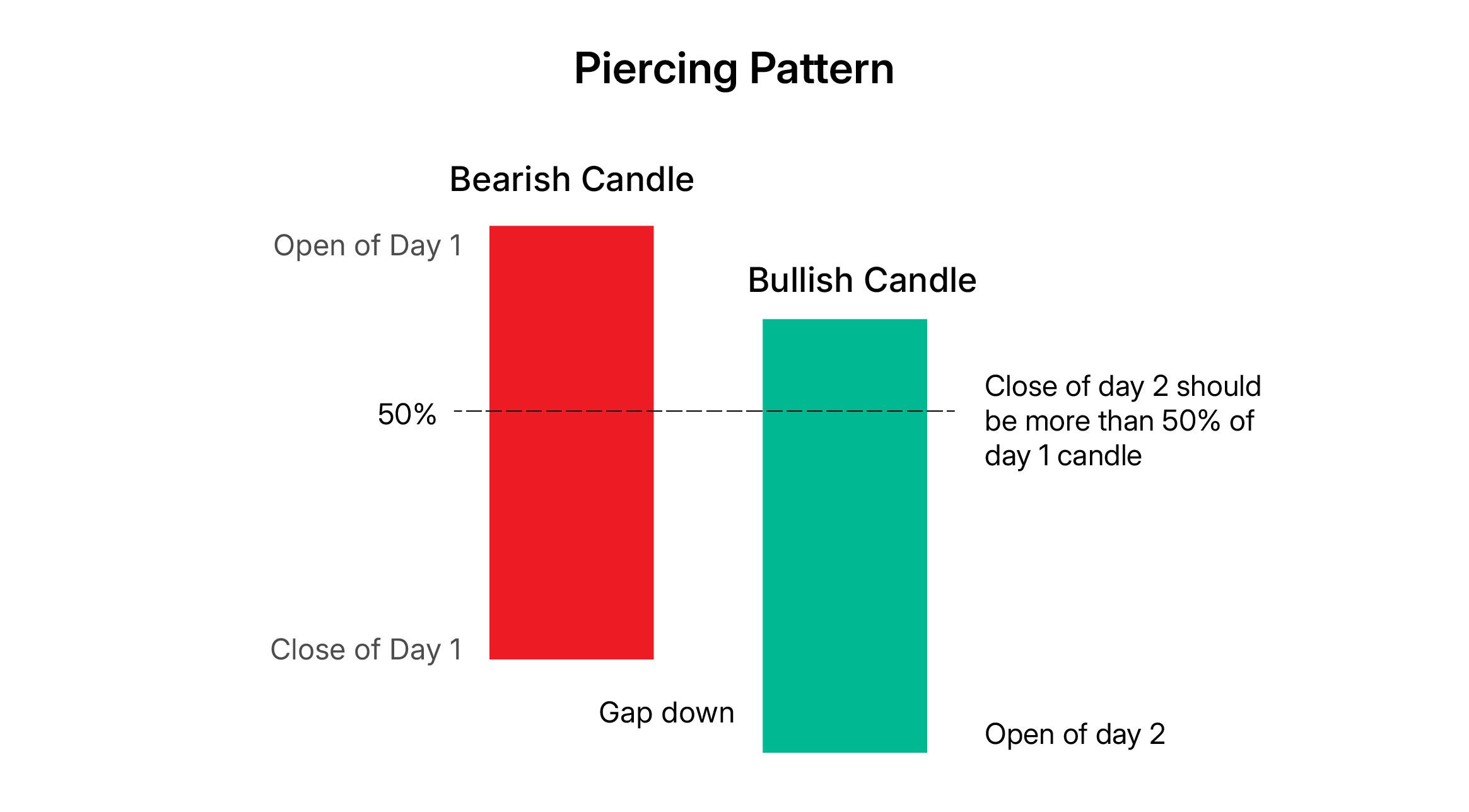 - The second candle is bullish (green or white) and opens lower than the previous close but closes above the midpoint of the first candle.