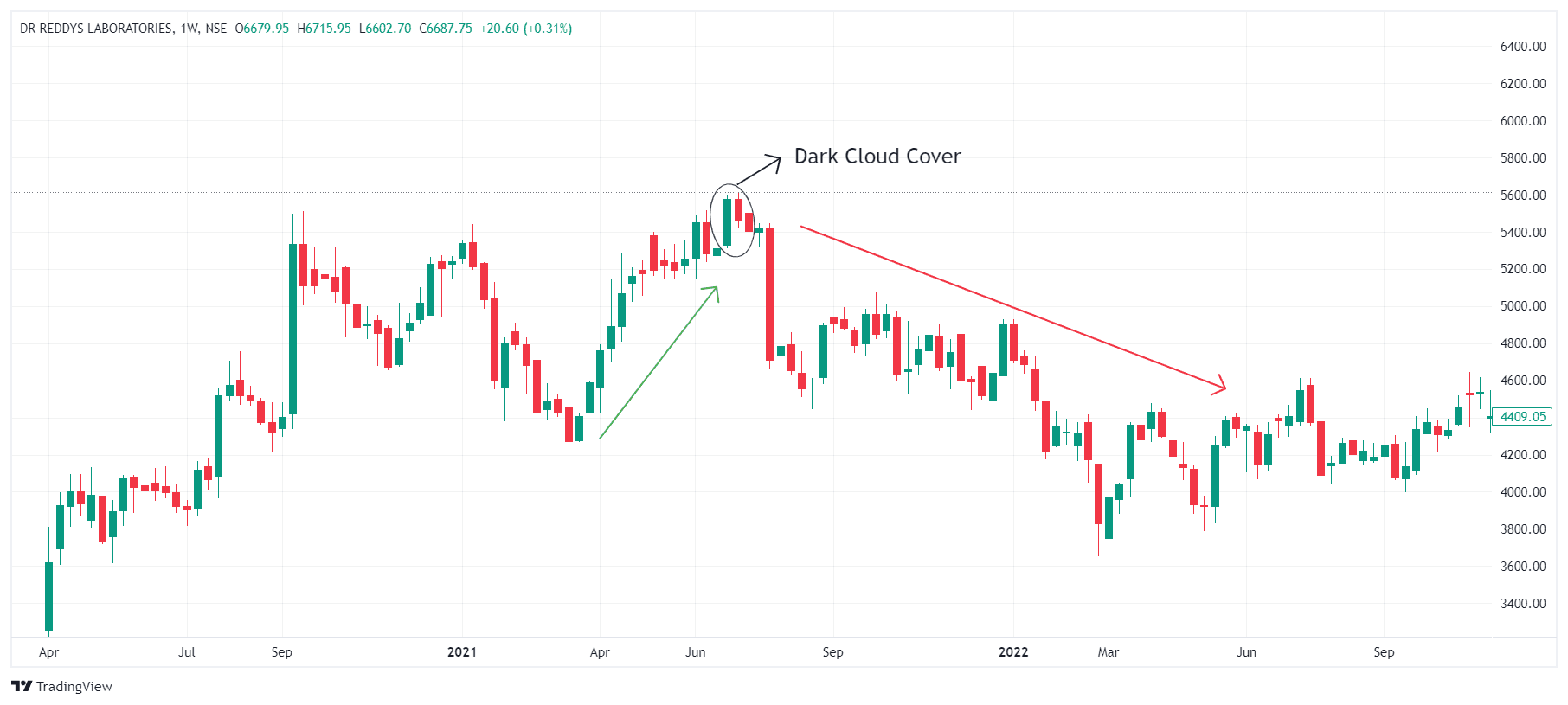 Consider Dr Reddys Laboratories Industries in an uptrend, with steady gains over the past few weeks. One day, a large green candle forms, continuing the upward momentum. The next day, however, the stock opens higher but reverses sharply, closing below the midpoint of the previous day’s candle. This creates a Dark Cloud Cover, suggesting that the uptrend may be over, and a bearish reversal could be imminent.