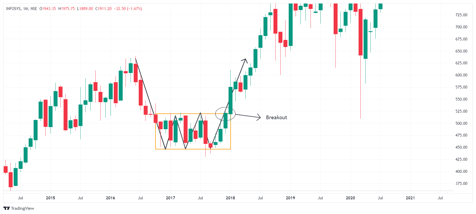 Imagine Infosys has been in a steady downtrend for several months, reaching a low of ₹470. The stock then enters a period of consolidation, bouncing between ₹470 (support) and ₹520 (resistance) for several weeks, forming a Rectangular Reversal Pattern. Eventually, the price breaks above ₹520, signalling a bullish reversal. Traders may choose to buy the stock at this point, anticipating a further decline.