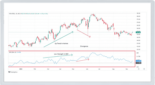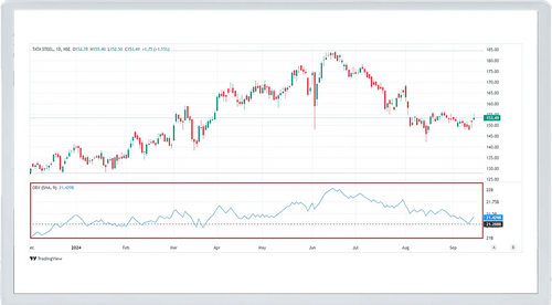 Let’s consider Tata Steel as an example. Suppose the price of Tata Steel has been rising steadily, but you notice that the OBV is not keeping pace and has started to flatten or even decline. This bearish divergence between price and OBV suggests that the upward momentum may be weakening and that the stock could be due for a pullback. Traders might take this signal as a warning to tighten stop-loss orders or even take profits before the price reverses.