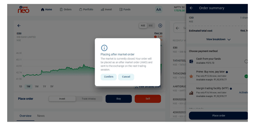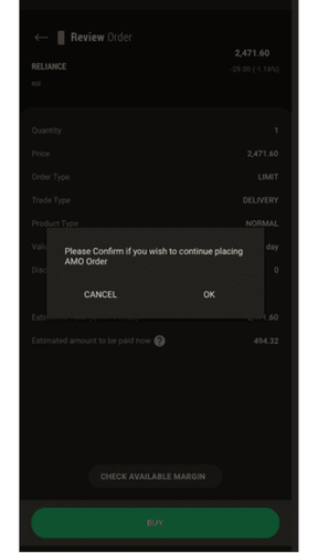 You can place AMO just like you place a normal buy/sell order. The app will automatically prompt you to convert the order to AMO when it is placed outside market hours. You can find the placed order under open orders with an AMO tag until it gets executed.