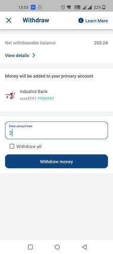 - Select your bank account and enter the amount you would like to withdraw. Even if you select a secondary bank account, you will receive funds in your primary bank account.