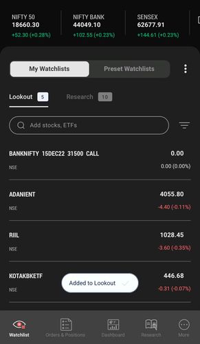 - Click on the + button next to the scrip name to quickly add it to the watchlist