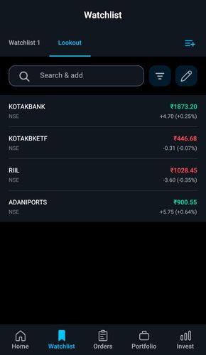 - Alternatively click on the scrip to view the details page with charts, general info, etc. Click on the + button on the top right corner of the screen to add the scrip to your watchlist