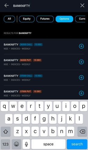 - On your home screen, use the search box to type in the scrip name>space>strike price>space>CALL or PUT>space>expiry date.