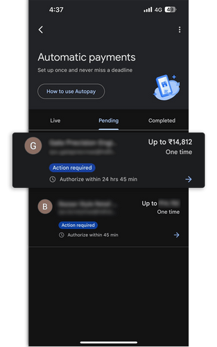 On the mandate request screen, under the Pending section, you will see the autopay request from the IPO company name you have applied for, along with the UPI ID, and the amount to be debited.